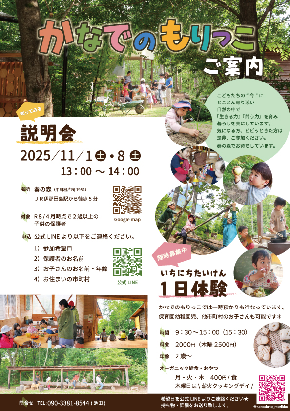 2025 11月 かなでのもりっこ説明会2025 今年も開催いたします。入園ご検討のご家庭のみなさん、ぜひご参加ください♪ Share Line note 記事のタイトルとURLをコピーする イベント一覧